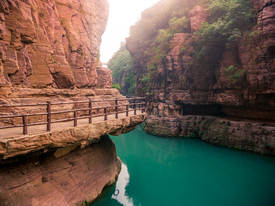 【紅石峽(下車參觀)】又名溫盤峪,它集泉瀑溪潭澗諸景於一穀,融雄險奇幽諸美於一體,被風景園林專家稱讚為「自然山水精品廊」。紅石峽,這方石英砂岩峽谷,因富含氧化鐵, 經子房河水長年侵蝕,夢幻般的丹崖碧水,集秀、幽、雄、險於一身,泉、瀑、溪、潭于一穀”的奇景。紅石峽南端有一狹窄的峽谷稱為“一線天”,有瀑高50餘米的白龍瀑布。