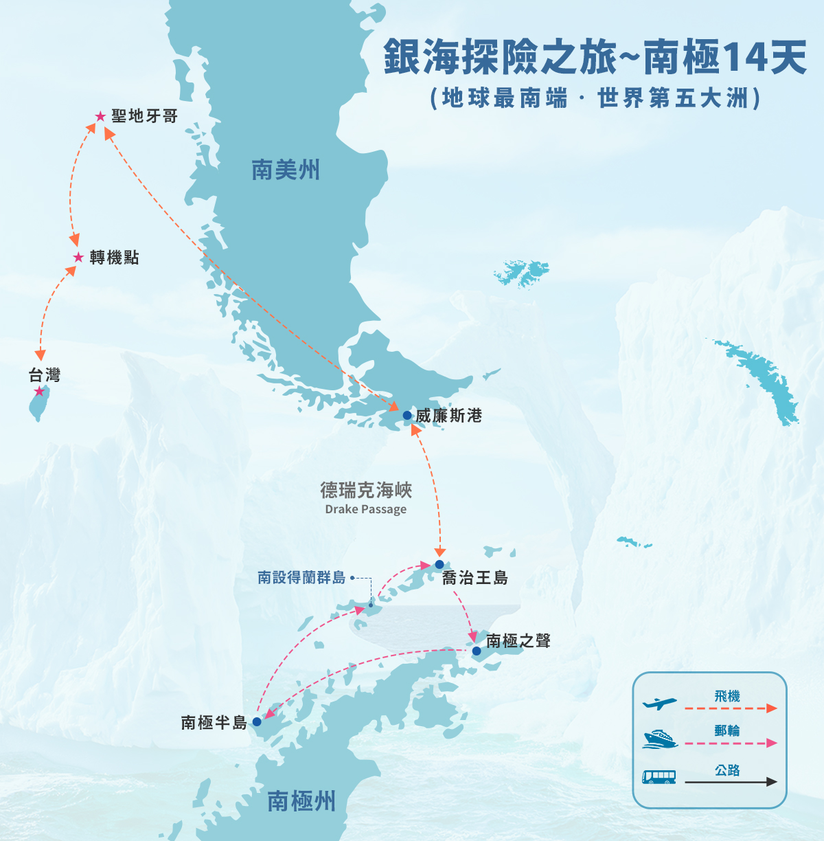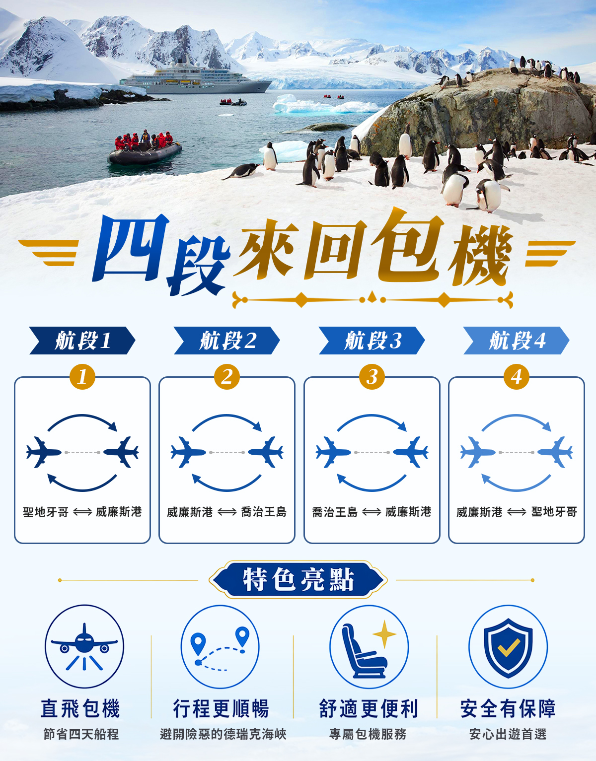 我們選擇搭乘專屬★包機,直接飛越這段世界最狂野的海域,從南美洲直抵南極門戶,將時間留給更純粹的探索。
