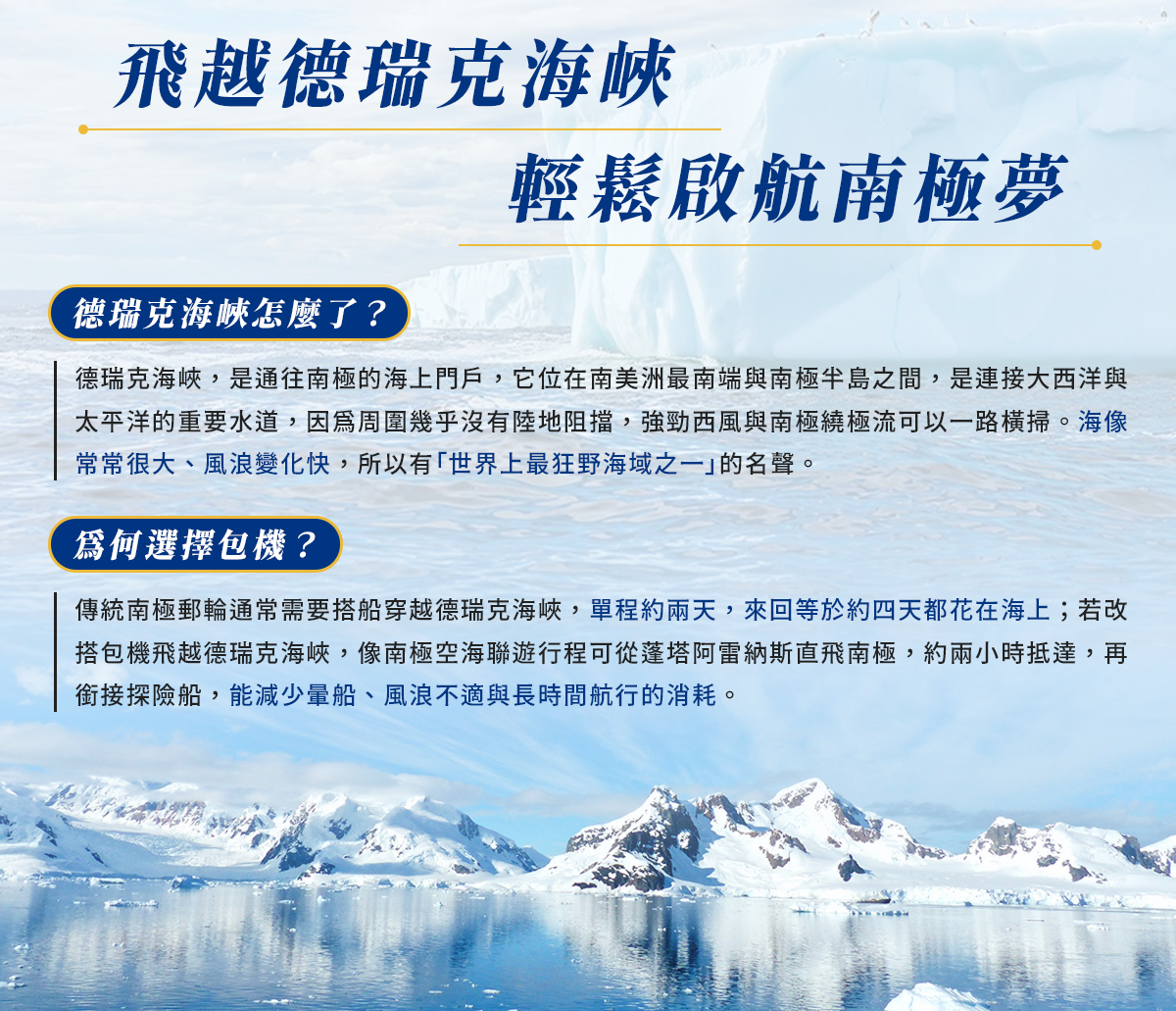 在多數人的想像中,南極之旅意味著橫越風浪洶湧的德瑞克海峽(Drake Passage)